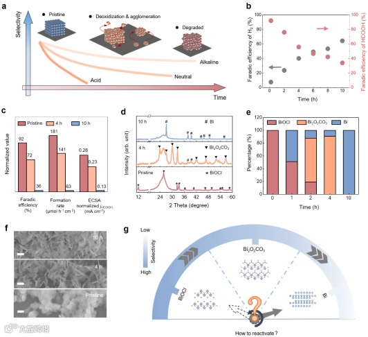 图1:酸性电解液中动态催化剂的降解分析。(a)不同电解液中催化剂稳定性下降示意图;(b)稳定性测试;(c)三种催化剂重构状态下的性能对比;(d-f)三种催化剂重构状态下的XRD、物相含量以及SEM;(g)酸性CO2RR稳定性随BiOCl重构而下降的示意图。