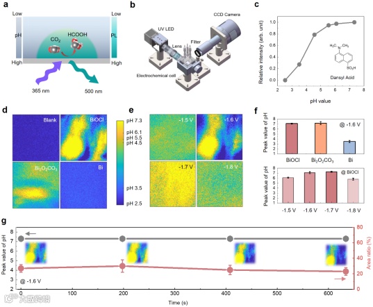 图2:原位荧光成像技术揭示催化剂表面局部pH变化。(a)技术原理示意图;(b)装置图;(c)荧光指示剂与pH的关系;(d)四种催化剂状态在-1.6 V vs Ag/AgCl的荧光成像结果;(e)BiOCl催化剂状态在不同电势下的荧光成像结果;(f)局部pH的统计平均值;(g)催化剂表面的荧光稳定性。