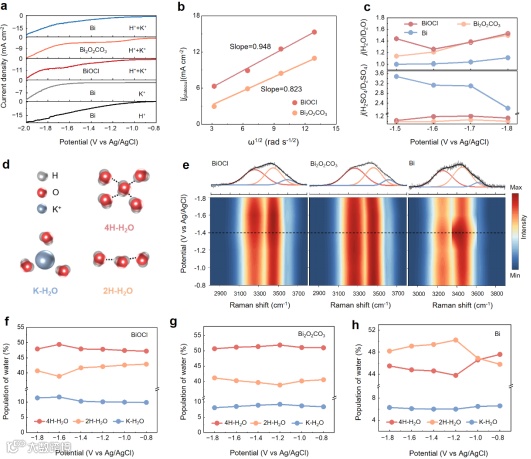 图3:阳离子的竞争吸附用以解释局部pH的变化机制。(a)旋转圆盘电极下的LSV曲线;(b)基于Levich方程的转速与电流平台的线性拟合;(c)三种重构状态的同位素动力学效应;(d)界面水结构示意图;(e)原位拉曼图谱;(f-h)三种重构状态的界面水结构含量分析。