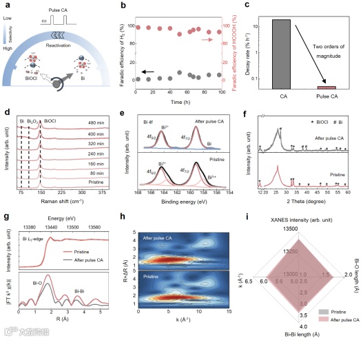 图5:脉冲电势用以激活催化剂。(a)脉冲激活示意图;(b)脉冲电势下的稳定性测试;(c)与传统电解方式的衰减率对比;(d)原位拉曼图谱;(e-i)初始状态和脉冲电势后的催化剂XPS、XRD、XAS以及材料结构对比。