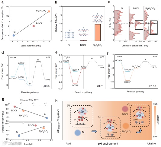 图4:催化剂的表面性质对微环境影响。(a)Zeta电位与K+吸附的关系图;(b)三种催化剂状态表面的K+相对吸附自由能;(c)K+吸附在三种催化剂表面的态密度图;(d-f)CO2RR和析氢反应中间体的吸附台阶图;(e)法拉第效率与CO2RR中间体本征吸附能力以及局部pH的关系;(h)机理总结图。