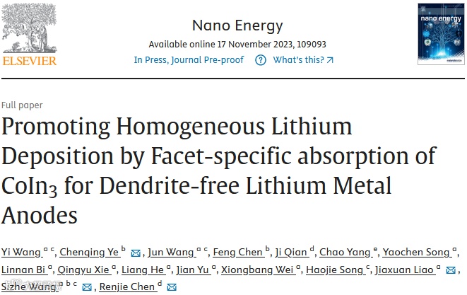 通过CoIn3的面特异性吸附促进无枝晶锂金属阳极的均匀锂沉积