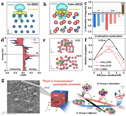 图3. (a,b) Co和CoIn3晶体结构的电荷密度差异;(c) 计算出的Co、CoIn3 和C原子不同面的锂结合能;(d) Co和CoIn3金属中心与锂原子之间的投影晶体轨道汉密尔顿布居 (pCOHP);(e)CoIn3(122)晶面和CoIn3(112)晶面上锂离子扩散路径的分子结构;(f)CoIn3(122)面、CoIn3(112)面和C(001)面的锂扩散势垒分布;(g) CoIn3合金典型的EBSD图案以及锂、Co和具有不同晶面的CoIn3之间相互作用的示意图。