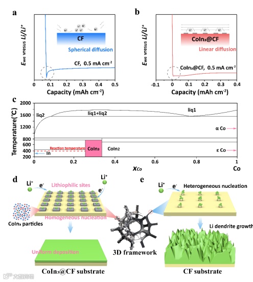 通过原位合金化技术合成了由CoIn3颗粒包裹CF骨架构建的3D多孔亲锂主体。图2c显示,CoIn3颗粒均匀且致密的分布在CF基底上,为锂的还原提供了丰富的成核位点。同时,CoIn3@CF主体具有优异的锂润湿性,可有效储存活性金属锂(图2d)。