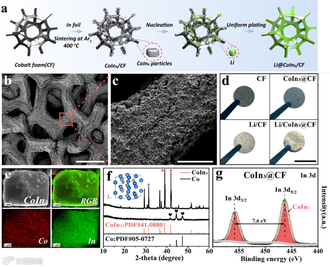 图2. (a) 在CF上生长的CoIn3颗粒以及在CoIn3@CF主体上沉积锂金属的示意图;(b,c)不同倍数下CoIn3@CF主体的SEM图像(比例尺:200μm,比例尺:50μm);(d)CF、CoIn3@CF主体、Li/CF阳极和Li/CoIn3@CF负极的数码照片(比例尺:1cm);(e) CoIn3颗粒的SEM图像和相应的元素映射图像;(f) CoIn3@CF和CF主体的XRD图谱;(g) CoIn3@CF主体的In 3d峰的XPS图谱。