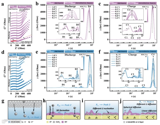 图4. (a,d)Li||CoIn3@CF和Li||CF电池在第一个充放电循环期间的电化学阻抗谱;(b, e) 根据Li||CoIn3@CF和Li||CF电池放电过程中不同电压下的EIS测量计算出的 DRT;(c, f) 根据Li||CoIn3@CF和Li||CF电池充电过程中不同电压下的EIS测量计算出的DRT;(g-j) 不同电化学反应过程的DRT曲线中特征峰对应的示意图。
