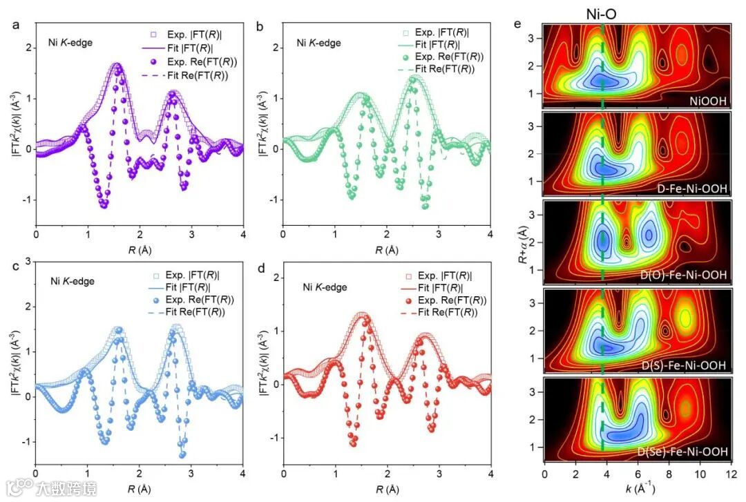 Figure 2. k2-weighted Fourier transformed EXAFS at the Ni K-edge of the D-Fe-Ni-OOH a), D(O)-Fe-Ni-OOH b), D(S)-Fe-Ni-OOH c) and D(Se)-Fe-Ni-OOH d) with EXAFS fitting. e) Wavelet transform for k2-weighted EXAFS signals at the Ni K-edge of catalysts.