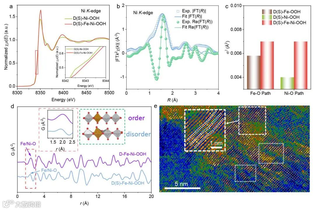 Figure 4. a) Ni K-edge XANES of D(S)-Ni-OOH and D(S)-Fe-Ni-OOH. b) k2-weighted Fourier transformed EXAFS at the Ni K-edge of the D-Ni-OOH with EXAFS fitting. c) Debye-Waller factor (σ2) for D(S)-Fe-OOH, D(S)-Ni-OOH and D(S)-Fe-Ni-OOH extracted from EXAFS fitting results. d) PDF analysis for D-Fe-Ni-OOH and D(S)-Fe-Ni-OOH. Inset is a magnified view of the red box. e) HRTEM image of D(S)-Fe-Ni-OOH.