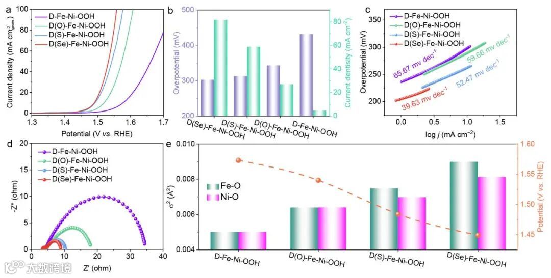 Figure 3. Electrocatalytic performance. a) polarization curves of D-Fe-Ni-OOH, D(O)-Fe-Ni-OOH, D(S)-Fe-Ni-OOH and D(Se)-Fe-Ni-OOH in 1M KOH at a scanning rate of 5mV s-1. b) Comparison of the overpotential at a current density of 50 mA cm-2 and the current density at an applied potential of 1.55 V vs. RHE for D-Fe-Ni-OOH, D(O)-Fe-Ni-OOH, D(S)-Fe-Ni-OOH and D(Se)-Fe-Ni-OOH. c) Tafel plots derived from the polarization curves in (a); d) EIS Nyquist plots. e) Comparison of the Debye-Waller factor (σ2) for catalysts extracted from EXAFS fitting results and the applied potential at a current density of 0.1 mA cm-2 ECSA.