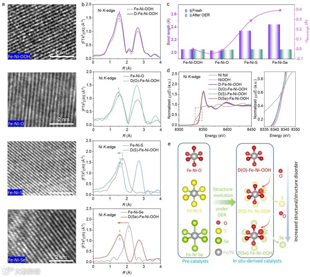 研究团队对模型预催化剂氧化物、硫化物、硒化物进行结构表征,XAFS表征结果表明衍生的(羟基)氢氧化物D(S)-Fe-Ni-OOH, D(Se)-Fe-Ni-OOH中Fe/Ni-O的键长与其对应的硫化物和硒化物预催化剂中的Fe/Ni-S, Fe/Ni-Se的键长具有明显的差异。
