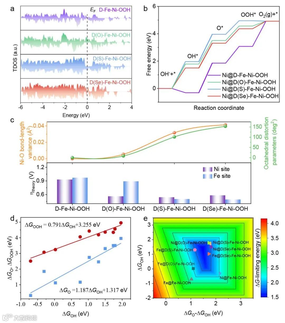 Figure 6. DFT calculations. a) TDOS of D-Fe-Ni-OOH, D(O)-Fe-Ni-OOH, D(S)-Fe-Ni-OOH and D(Se)-Fe-Ni-OOH. b) Free energy diagram for the OER over Ni sites for catalysts. c) Comparison of the theoretical calculated overpotentials and change in the octahedral distortion parameters of different DFT models. d) Linear scaling relationship for catalysts between the adsorption energy of OOH* versus the adsorption energy of OH* and between the adsorption energy of O* versus the adsorption energy of OH*. e) Calculated volcano plot of OER overpotential η with ΔGOH and ΔGO-ΔGOH as the descriptors.