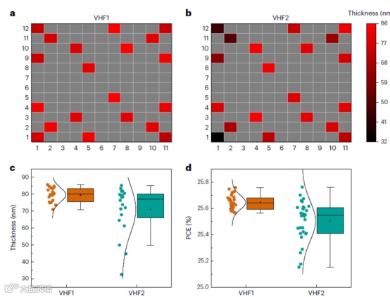 图1. VHF1和VHF 2沉积的 nc-SiOx:H(n)薄膜厚度和电池效率的均匀性对比