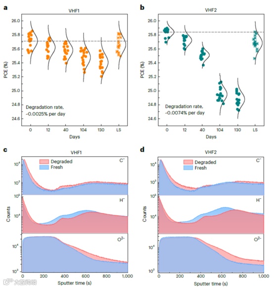 通过优化VHF1-nc-SiOx:H(n)窗口层,在丝印银电极全面积M6双面SHJ电池上实现25.98%的认证效率,与VHF2电池效率(26.02%)相当。同时,VHF1电池比VHF2电池表现出更小的暗衰。(130天内,VHF1电池平均衰减速率:约0.0025%/天,仅为VHF2电池的1/3(约0.0074%/天))。并且,VHF1电池在经过光浸泡后效率几乎可以全部恢复(-0.04%),而VHF2电池效率损失相对较大(-0.15%)。