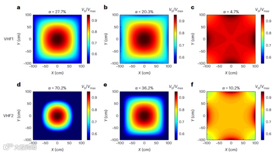开发了一种基于甚高频(27 MHz,VHF1)的大面积(2.03*2.03 m2)nc-SiOx:H(n)窗口层PECVD沉积系统。与甚高频(40 MHz, VHF2)相比,VHF1在大尺寸腔体中将驻波效应降至最低,表现出更优异的薄膜厚度均匀性和电池效率分布均匀性。
