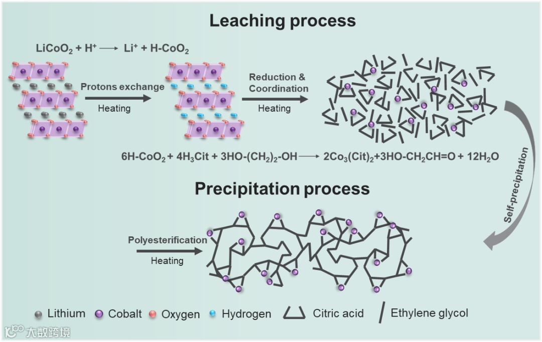 要点一:为了简化流程并提高回收效率,本文作者提出了一种新颖的多元醇冶金方法,柠檬酸(CA)溶于乙二醇(EG)制备的溶液(CAEG)同时作为浸出剂和共沉淀剂, 实现高效浸出和回收,并简化了正极金属材料与铝箔,PVDF和碳黑的分离过程。这一创新的方法解决了传统湿法冶金电池回收方法繁杂的分离和沉淀过程,极大增强了正极材料回收的便捷性和灵活性。以LCO正极材料为例,CAEG作为浸出溶液有效将正极材料浸出,并避免引入铝箔和聚偏氟乙烯(PVDF)/碳黑膜等杂质,使浸出溶液可以轻松的与轻松与铝箔和聚偏氟乙烯(PVDF)/碳黑膜分离。分离得到的金属浸出液继续反应,金属柠檬酸盐与乙二醇的酯化反应促使金属复合物的生成,从而完成后续的金属自沉淀回收过程,无需添加额外的沉淀剂,极大地简化了分离和共沉淀过程。在这项工作中,乙二醇被选择为反应介质、还原剂和配体。乙二醇中的羟基团是其主要优点,可(1)赋予聚醚高沸点,使反应能够在高温(约160°C)下进行以加速浸出动力学,以及(2)使乙二醇成为还原剂和配位介质。作为典型的有机酸,柠檬酸是最常用且低成本的螯合剂。添加柠檬酸显著促进了阴极材料的浸出,柠檬酸还在共沉淀过程中充当螯合剂的角色。双功能溶液的使用为先进的电池回收方法提供了极大的便利。