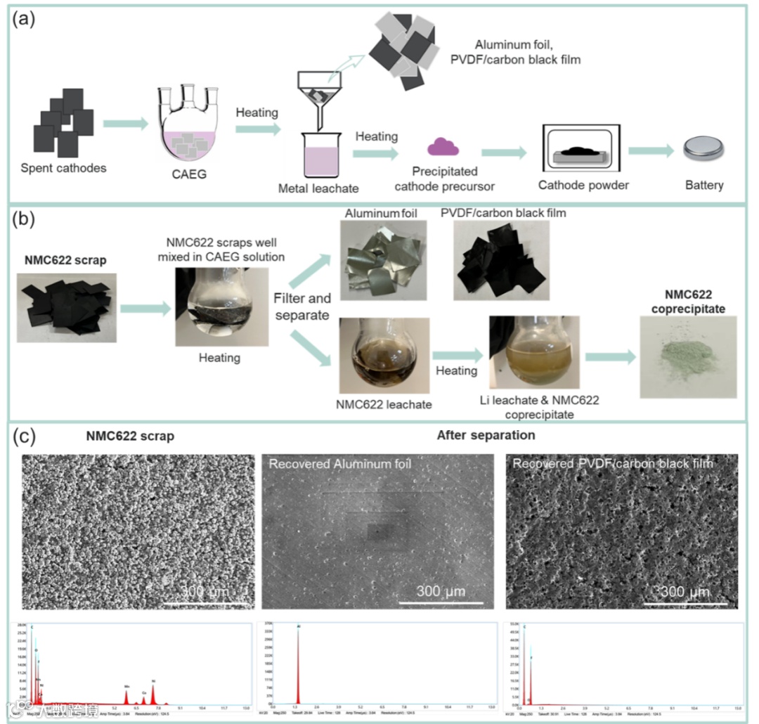 图2. (a) 正极回收过程示意图,(b) NMC622电极的回收过程照片,以及(c) NMC622电极、回收得到的铝箔和PVDF/碳黑膜的SEM图像和EDX光谱。