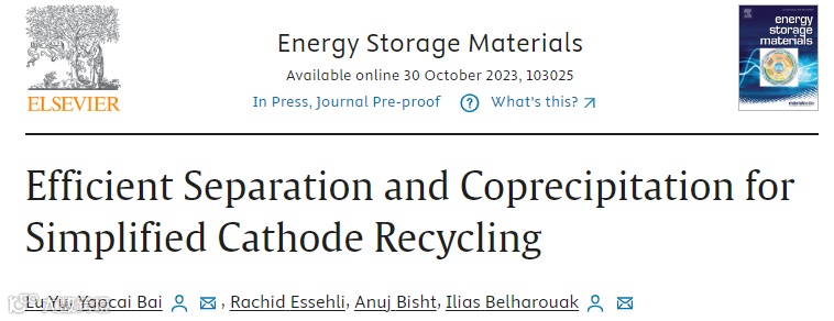 近日,来自橡树岭国家实验室的白耀彩和Ilias Belharouak团队,在国际知名期刊Energy Storage Materials上发表题为“Efficient Separation and Coprecipitation for Simplified Cathode Recycling”的研究文章。该文章分析了现在常用的电池回收方法以及现阶段最具有商业化应用潜力的湿法冶金回收方法存在的问题和挑战,并针对传统回收方法复杂的分离和沉淀方法提出了高效、简便且环保的多元醇冶金方法。利用乙二醇 (EG) 和柠檬酸 (CA)作为双功能绿色溶液,从阴极材料(如LCO)中浸出金属离子,然后通过金属柠檬酸盐与乙二醇酯化反应,有效的沉淀出Co, Ni, 和Mn金属复合物,无需额外的沉淀剂,极大的简化了沉淀过程。双功能溶液的独特特性还可以避免来自铝箔和PVDF/碳黑膜的杂质,实现了简单的分离过程。因此,该过程可以在一锅体系中完成,具有高效的浸出、分离和共沉淀,比现有替代方法更高效和可行。