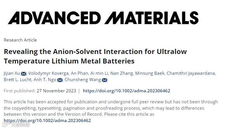 Jijian Xu, Volodymyr Koverga, An Phan, Ai min Li, Nan Zhang, Minsung Baek, Chamithri Jayawardana, Brett L. Lucht, Anh T. Ngo, Chunsheng Wang. (2023). “Revealing the Anion-Solvent Interaction for Ultralow Temperature Lithium Metal Batteries” Adv. Mater. DOI: https://doi.org/10.1002/adma.202306462