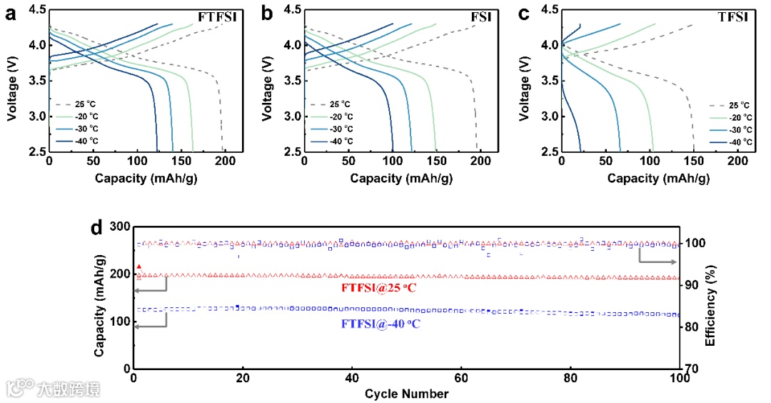 具体而言,1.5M LiFTFSI-BFPE电解液使锂沉积/剥离CE在零下30摄氏度的温度下高达98.7% ,并且使2.0 mAh/cm2 NMC811||Li(2倍过量)全电池在零下40摄氏度(甚至零下60摄氏度)的超低温环境中成功充放电。在100次循环后,该电池提供了高达115 mAh/g的可逆比容量,而且无明显的容量衰减。