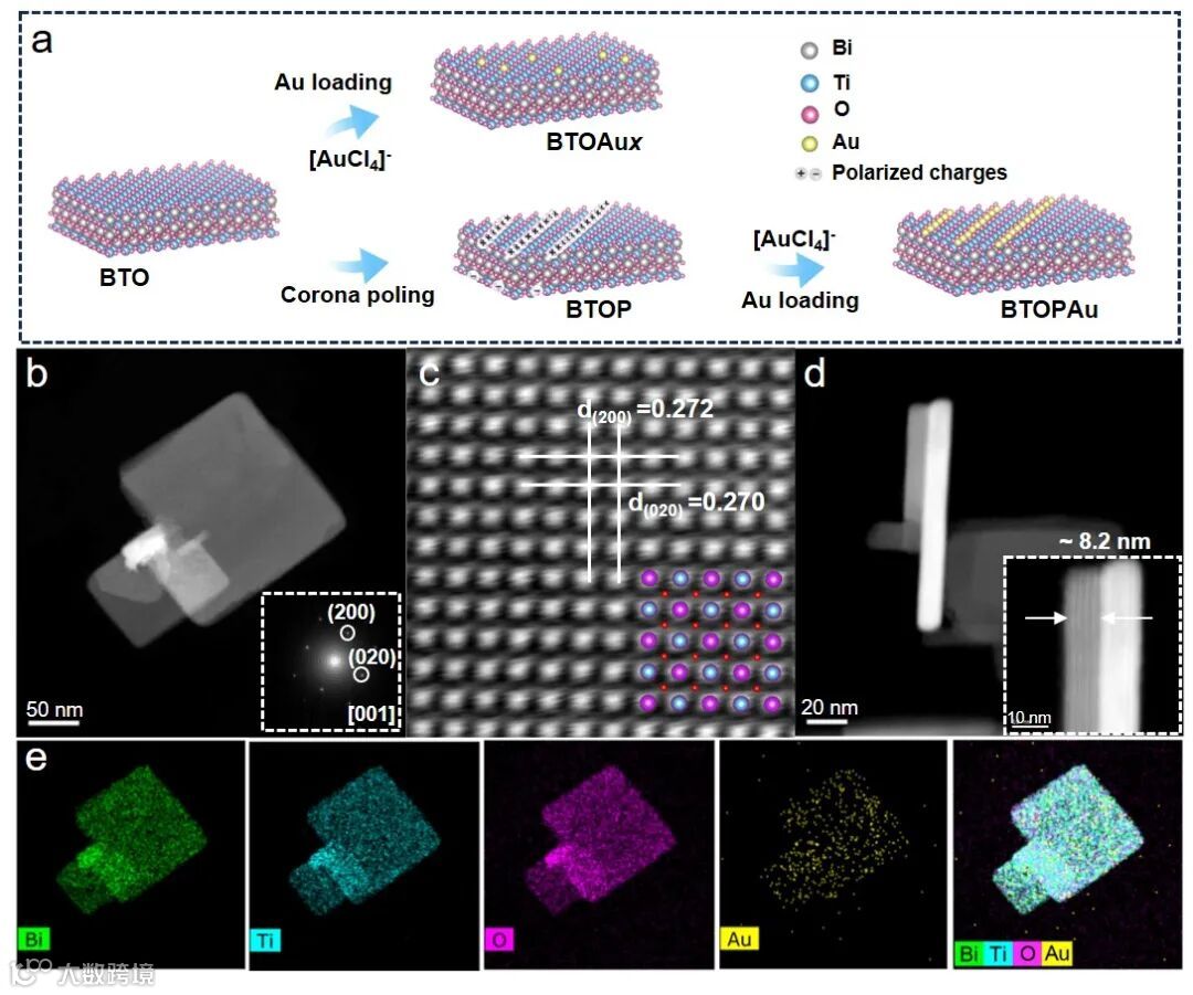 如图1所示,未极化的BTO由于电荷屏蔽效应,负载Au后形成常规离散单原子。引入电晕极化处理后,电畴偏转使其取向趋于一致,大幅增强的极化电场打破了电荷平衡,在BTO表面出现了大量未被屏蔽的取向一致的极化电荷,进一步吸附前驱体后形成1D Au arrays。