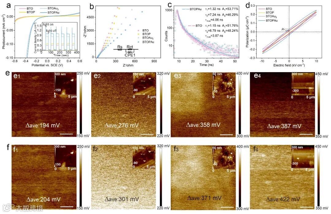 图4. 光电化学、电滞回线及KPFM对样品的光生电荷分离进行分析。