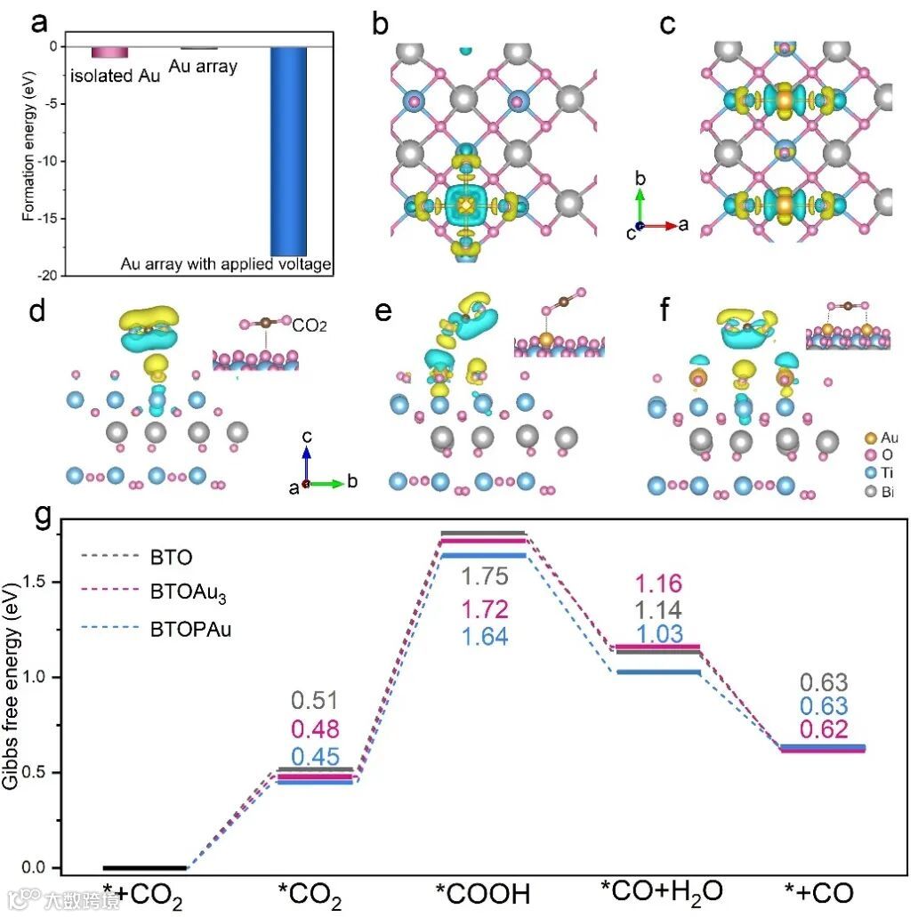DFT分析表明在电场存在的条件下,1D Au SA arrays以更稳定的状态负载在BTO表面,指出了形成该独特单原子构型的内在原因。电荷分布显示Au原子表现出与BTO的电荷相互作用,使得Au位点是电荷积累和转移位点,也是吸附和活化CO2的主要催化位点。此外,CO2吸附模拟表明,在Au i-SA中CO2主要以Au-O=C=O单位点吸附的方式吸附在Au位点上,而1D Au SA arrays则是通过Au-O=C=O-Au的双位点吸附CO2分子,这在Au和CO2之间提供了更强烈的电子转移和更强的亲和力。根据原位FTIR光谱得到的反应路径,计算了BTO、BTOAu3(负载Au i-SA)和BTOPAu(负载1D Au SA array)上CO2还原的吉布斯自由能。吸附的中间体*COOH的形成是CO2还原的决速步。所有样品上的CO2吸附和*COOH形成都是吸热过程,而*CO的形成和CO脱附则是放热过程。与BTOAu3和BTO相比,BTOPAu在吸热过程中表现出较低的反应势垒,这表明CO2在BTOPAu上更容易活化和转化,从而获得更高的光催化活性,证实了实验结果。