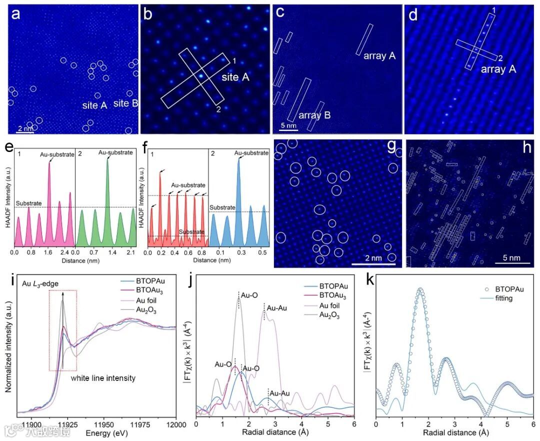 通过电晕极化装置调控BTO的极化电场,得到极性调控前、后(BTOP)的BTO,再负载Au单原子,分别得到了负载i-SA(BTOAuX, x=1,2,3,4)和1D Au SA arrays (BTOPAu3)样品。通过球差电镜观测到了负载i-SA和1D Au SA arrays样品表面Au单原子的不同构型。i-SA以无序的、离散的形式分布在BTO表面,1D Au SA arrays在钛酸铋表面形成了一维阵列构型。多区域的球差电镜图统计分析对Au原子的分布情况进行的定量分析,Au单原子的覆盖率(CAu)在BTOAu3和BTOPAu表面分别为~6.24%和~6.65%,与ICP测试得到的结果相符合。同步辐射的近边吸收和结构拟合分析了这两种单原子的价态、配位和构型,证明了BTOAu3中Au主要以i-SA形式存在,而Au在BTOPAu中主要以1D SA arrays存在。