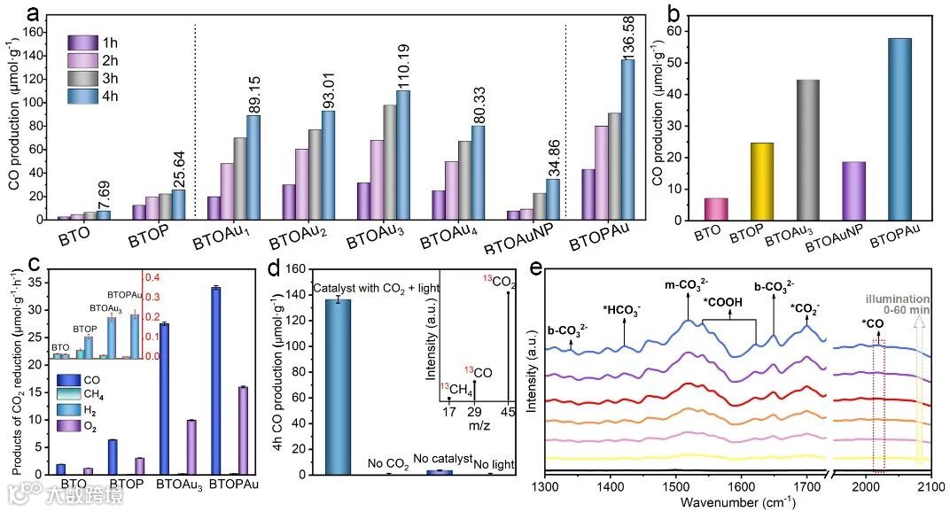 CO2RR测试表明,在没有光敏剂和牺牲剂的情况下,原始BTO还原CO2的主要产物为CO,速率为1.92 µmol·g−1·h−1,BTOP催化CO2的速率增加到6.41 µmol·g−1·h−1,揭示了极化电场在光生载流子分离过程中的优势。在BTOAuX(x = 1, 2, 3, 4)系列样品中,最佳Au负载比例样品的CO产率为27.55 µmol·g−1·h−1,表明Au i-SA的负载显著提高了BTO的CO2还原活性。并且,所有的BTOAuX样品都显示出比负载Au纳米颗粒样品(BTOAuNP)更好的性能,表明SACs在提高光催化活性方面的优越性。与Au i-SA相比,1D Au SA arrays有显著提高的CO2光还原活性,BTOPAu的CO形成速率达到34.15 µmol·g−1·h−1,这分别是BTOAuNP和原始BTO的约4倍和18倍,揭示了极化电场协同多位点催化的优势。原位红外光谱分析了CO2RR的反应路径。
