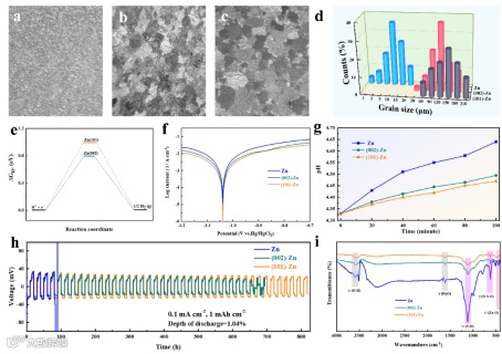 图 4.用 H2O2 溶液进行化学抛光后的金相显微照片:(a) 裸锌,(b) (002)-Zn 和 (c) (101)-Zn 电极。(d) 尺寸统计分析。(e) (002) 和 (101) 平面上 H 吸附的自由能。(f) 2 M ZnSO4 电解液中的 Tafel 图。(g) 不同时间下电极界面的 pH 监测曲线。(h) 在 0.1 mA cm-2 和 1 mAh cm-2 条件下的对称电池循环曲线。(i) 循环后锌电极的傅立叶变换红外图谱。