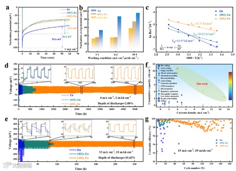 图3.(a) 1 mA cm-2 时不同基底上锌沉积的成核过电势。(b) 不同电流密度下成核过电势的比较。(c) 通过阿伦尼乌斯方程拟合去溶剂化活化能曲线。(d) 2 mAhcm-2、4 mA cm-2 下的对称电池循环曲线。(e) 10 mAh cm-2、15 mA cm-2下的对称电池循环曲线。(f) 本工作与其他报道之间的累积容量比较。(g) 非对称电池在 15 mA cm-2 和 10 mAh cm-2下的 CE 性能。