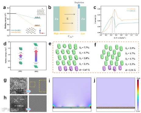 图2.(a) 锌原子在不同平面上的吸附能。(b) 由于传质受限导致锌表面锌离子耗竭。(c) 不同电极的极限电流测试。(d) 晶格畸变前后不同晶面表面能的比较。(e) Zn(002) 和 (f) Zn(101)上沉积的四层锌的 Ab initio 分子动力学(AIMD)模拟,与每层的晶格畸变值相对应。(g) (002)-Zn 和 (h) (101)-Zn 镀锌层的 HRTEM 图像。电沉积后 (i) (002)-Zn 和 (j) (101)-Zn 电极界面电场分布的有限元模拟。