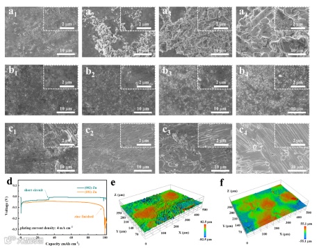 图1. 沉积在裸锌电极、(002)-锌电极和(101)-锌电极上不同容量锌的扫描电镜图片:(a1,b1,c1) 1 mAh cm-2,(a2,b2,c2) 3 mAh cm-2,(a3,b3,c3) 4 mAh cm-2,(a4,b4,c4) 5 mAh cm-2。(d) 电流密度为 4 mA cm-2 时,沉积在不同电极上的电压容量曲线。电池短路后 (e) (002)-Zn 和(f) (101)-Zn 的 WLI 3D 高度图像。