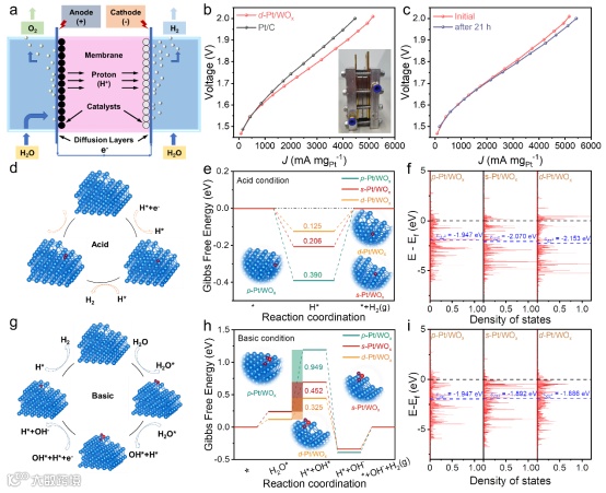 质子交换膜水电解槽(PEMWEs)中,d-Pt/WOx//IrO2在2.0 V的质量活性达5158 mA mgPt-1,显著高于商业Pt/C//IrO2体系,并表现出优异的稳定性。DFT计算结果说明,具有最高缺陷密度的d-Pt/WOx 在酸性溶液中显示出降低的反键带和最低的dz2 带中心,有利于氢的吸附和释放。在碱性介质中,d-Pt/WOx具有最高 dz2 带中心,有利于吸附水分子中的氢,并促进水的分解。