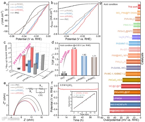 在三电极体系中进行酸性和碱性条件下的HER性能测试,测试结果表明随着缺陷密度的增加,HER性能逐渐增强。在酸性和碱性环境中,具有最高缺陷密度的d-Pt/WOx催化剂达到10 mA cm-2分别仅需4和16 mV,其TOF值分别是Pt/C的11.6和22.8倍。