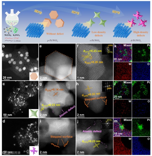 通过湿化学法一步合成Pt/WOx催化剂。将反应过程中的温度调控为170、200和240℃,可以将Pt纳米晶的形貌调控为多边形(p-Pt/WOx)、星形(s-Pt/WOx)和枝晶形(d-Pt/WOx)。并通过控制不同的反应时间,探究了纳米晶的生长过程。使用球差电镜揭示Pt纳米晶的原子排列,多边形Pt纳米晶的原子尺度结构显示出规则的边缘,且没有缺陷存在。而在星形的Pt纳米晶中观察到少量的原子缺陷和台阶表面。进一步地,在枝晶形的Pt中观察到高密度的结构缺陷。