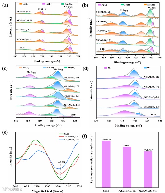 XPS结果表明使用废旧锂离子电池为原料制备的NiCoMnOx-1.5催化剂表面Co3+和Mn4+含量最高,有利于增强NO氧化为NO2的能力,进一步促进“快速SCR反应”。废旧锂离子电池阴极材料(SLIB)表面的氧缺陷浓度最高,这与废旧锂离子电池重复充放电过程有关。使用草酸酸浸和热处理后制备的NiCoMnOx-1.5催化剂表面的氧缺陷减少,这表明酸浸过程破坏了原有的氧缺陷,但其浓度仍高于使用金属盐为原料制备的催化剂(NiCoMnOx-MS),证明了使用锂离子电池为原料的优越性。EPR实验定量分析结果表明催化剂表面氧空位的自旋浓度顺序为SLIB > NiCoMnOx-1.5 > NiCoMnOx-MS,与XPS的结果一致。