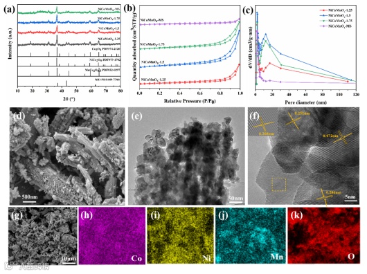 通过 SEM表征可以发现NiCoMnOx-1.5催化剂具有丰富的孔隙结构,TEM图像进一步证明了催化剂是由纳米片构建的多孔结构,这是由于C2O42-在煅烧过程中分解产生大量气泡,导致催化剂表面产生多孔疏松的结构。HRTEM图像中可以检测到d间距为0.472、0.286、0.251和0.208 nm的晶格条纹,分别对应于MnCo2O4.5、Co2NiO4和Co3O4晶相的(111)、(220)、(311)和(400)平面。NiCoMnOx-1.5的EDS-mapping结果证明了Co、Mn和Ni元素的均匀分布。