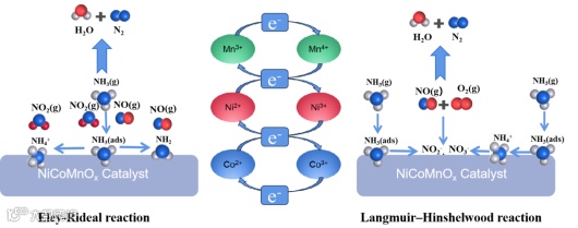原位红外测试结果表面NiCoMnOx-1.5催化剂表面的反应遵循Langmuir-Hinshelwood机理和Eley-Rideal机理。与NiCoMnOx-MS催化剂相比,NiCoMnOx-1.5催化剂表面存在更多的吸附氨物种和硝酸盐物种,且吸附物种能够更好的参与到SCR反应中,故具有更加优异的催化活性。