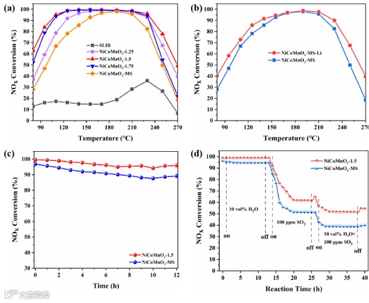 要点三:与相同条件下使用金属盐为原料制备的催化剂相比,使用废旧锂离子电池制备的催化剂具有更加优异的低温SCR活性 。
