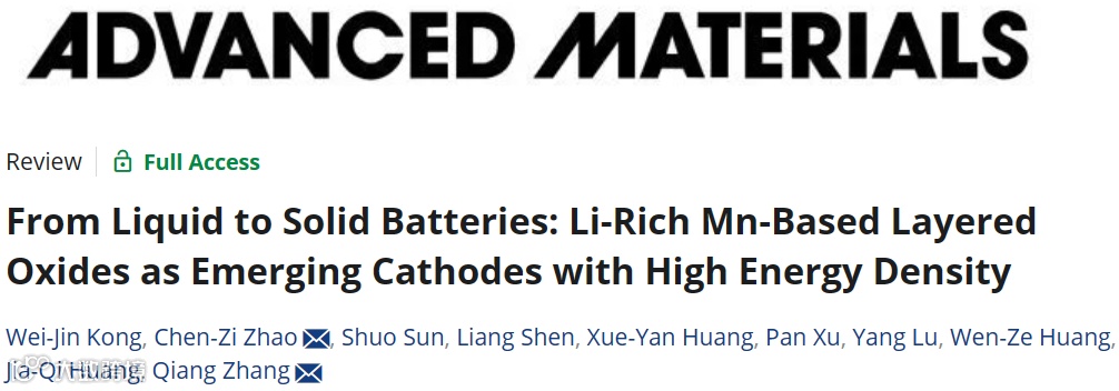 清华大学化工系张强、赵辰孜团队在国际顶级期刊Advanced Materials上发表了题为“From Liquid to Solid Batteries: Li-Rich Mn-Based Layered Oxides as Emerging Cathodes with High Energy Density”的文章。该文章分析了富锂锰基正极材料在全固态电池中应用的相关挑战与基本认识和理解。提出了界面机械和化学不稳定性的机制,进一步介绍了增强在固态电池中阴离子氧的氧化还原反应可逆性、高电压正极与电解质界面稳定性和促进锂离子转移动力学的策略。此外,还提出了促进富锂锰基正极材料在全固态电池中规模应用的潜在研究方法。
