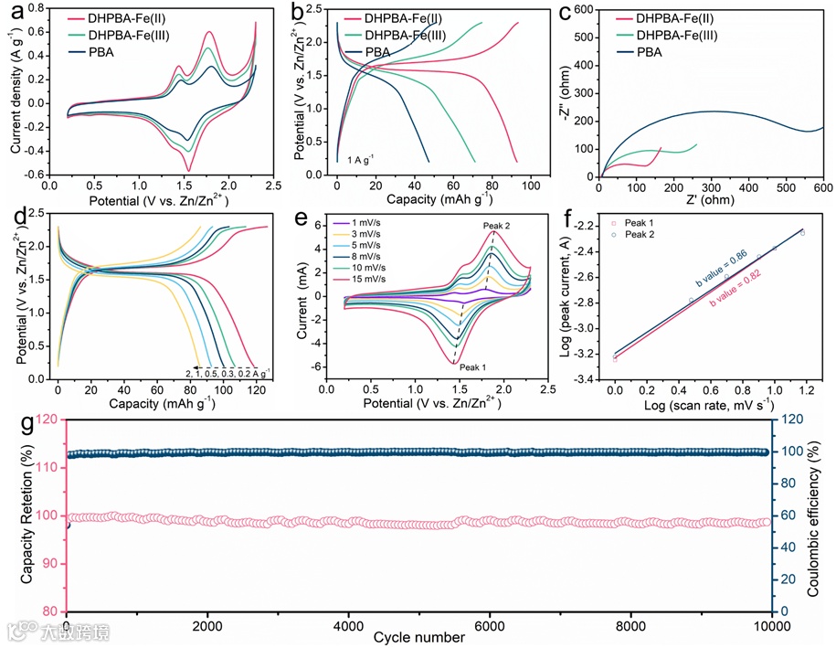该电极材料DHPBA-Fe(II)展现出在水系锌离子电池中优异的储能性能。其独特的双壳开放中空结构为Zn2+离子提供了灵活的迁移和存储通道,因此在电池循环中表现出卓越的稳定性。通过内外生长策略合成的DHPBA-Fe(II)具有高度结晶性和明确的晶态结构,确保了电极材料的稳定性。电化学阻抗谱(EIS)分析揭示了DHPBA-Fe(II)在电子传输和离子扩散方面的出色性能,表现出更快的电子传输和更小的电荷传输电阻。其卓越的储能性能体现在高达92.5 mAh g-1的比电容,以及在1 A g-1充电密度下的10,000个循环后依然保持卓越的稳定性。