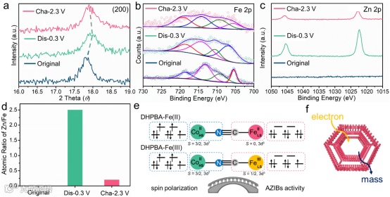 该电极材料(DHPBA-Fe(II))在水系锌离子电池中的储能机理主要涉及Zn²⁺离子的插入和提取过程。通过详细的电化学和物理性质分析,研究团队确定了Zn²⁺离子在充放电过程中通过电极材料进行插入和提取的机制。X射线光电子能谱(XPS)和X射线衍射(XRD)分析结果显示,在电池循环过程中,电极材料的结构未发生明显相变,但(200)晶面发生了偏移,暗示Zn²⁺离子的插入导致了晶格畸变。此外,通过研究Fe的电子态与电池性能的关系,确认了DHPBA-Fe(II)中存在Fe(II)的低自旋态,这被认为是提高电池高电压容量的关键因素。综合来看,DHPBA-Fe(II)在AZIBs中表现出的卓越性能与其双壳结构、丰富的Fe(II)活性位点以及Zn²⁺离子插入导致的晶格畸变等因素相互作用,为水系锌离子电池的设计提供了有价值的机理解析。