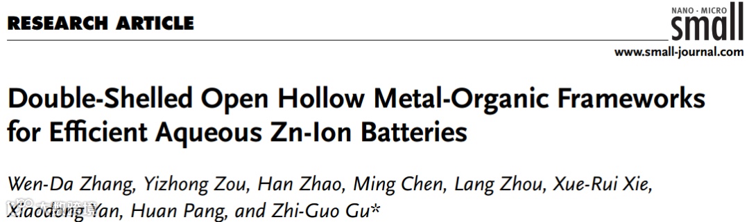 近日,来自江南大学的顾志国教授,在国际知名期刊Small上发表题为“Double-Shelled Open Hollow Metal-Organic Frameworks for Efficient Aqueous Zn-Ion Batteries”的文章。
