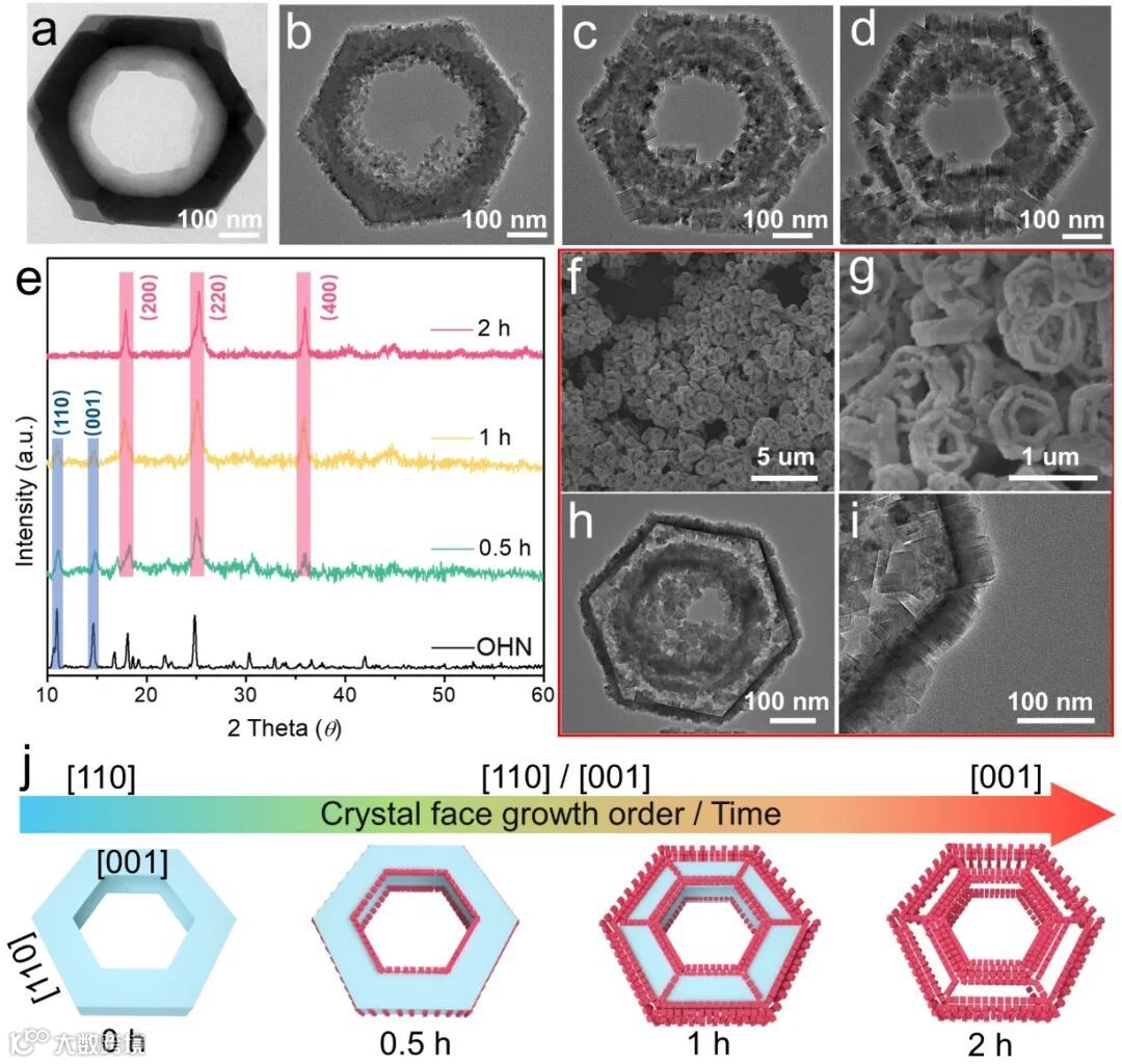 通过2,2'-联吡啶、草酸和氯化钴的反应制备出开放中空的MOFs,命名为OHN(open hollow nut-like MOFs)。这种结构具有适当的配位键强度、明确定义的晶体表面和大的开放通道。在内外生长过程中,OHN作为模板与金属配体[Fe(CN)6]4⁻进行反应。在0.5小时的反应中,DHPBA-Fe(II)主要沿[110]方向生长,形成核-壳结构。XRD图谱显示OHN的[110]平面的衍射峰减弱,而DHPBA-Fe(II)的[220]平面的衍射峰增强,表明晶格匹配生长。随着反应时间的延长,DHPBA-Fe(II)的生长方向扩展到[001]平面,形成三层壳结构,OHN在PBAs层之间可见,最终形成明显的双壳结构。此外,使用[Fe(CN)6]3⁻作为金属配体同样可以得到双壳结构,证明了该策略的普适性。