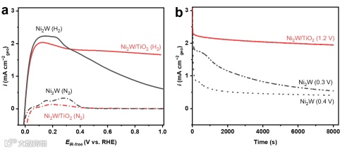 图6. Ni2W和Ni2W/TiO2在(a)H2和N2饱和0.1 M NaOH溶液中极化曲线以及在(b)H2饱和0.1 M NaOH溶液中不同阳极过电位下计时电流曲线