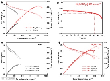 图2.(a)Ni4Mo和Ni4Mo/TiO2阳极AEMFC极化曲线和功率密度曲线图;(b)Ni4Mo/TiO2阳极AEMFC在400 mA cm−2电流密度的长期耐久性测试;(c)Ni4Mo和(d)Ni4Mo/TiO2阳极AEMFC连续三次循环放电的极化曲线和功率密度曲线