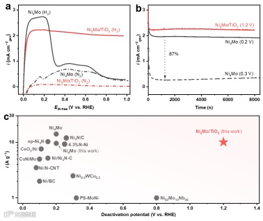 图1. Ni4Mo和Ni4Mo/TiO2在H2和N2饱和0.1 M NaOH中(a)CV曲线和(b)不同阳极过电位计时电流曲线;(c)镍基非贵金属碱性HOR电催化剂的失活电位和质量活性