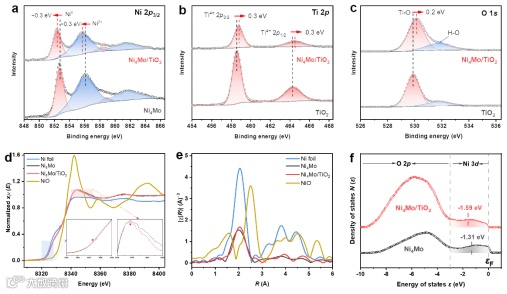 图4. Ni4Mo/TiO2和Ni4Mo的(a)Ni 2p3/2、(b)Ti 2p、(c)O 1s、(d)归一化的Ni K边X射线吸收光谱(左插图为放大的近边,右插图为放大的白线)、(e)傅立叶变换Ni K边EXAFS谱和(f)UPS测得的费米能级附近的态密度