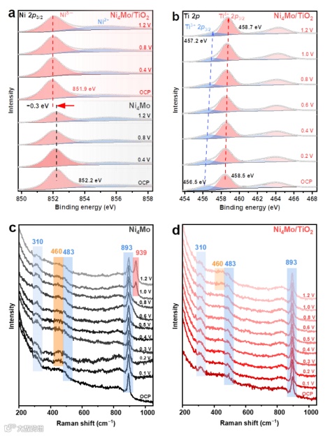 图5. Ni4Mo和Ni4Mo/TiO2在(a和b)H2和N2混合气饱和的0.1 M NaOH溶液中准原位XPS图谱;(c和d)H2饱和0.1 M NaOH溶液中原位Raman图谱