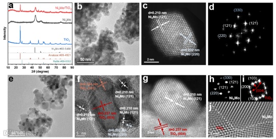 图3.(a)Ni4Mo、Ni4Mo/TiO2和TiO2的XRD图;Ni4Mo的(b)TEM图、(c)HAADF-STEM图以及(d)相应的FFT图;Ni4Mo/TiO2的(e)TEM图、(f)HR-TEM图、(g)HAADF-STEM图、(h和i)相应的FFT图以及(j)反向FFT图
